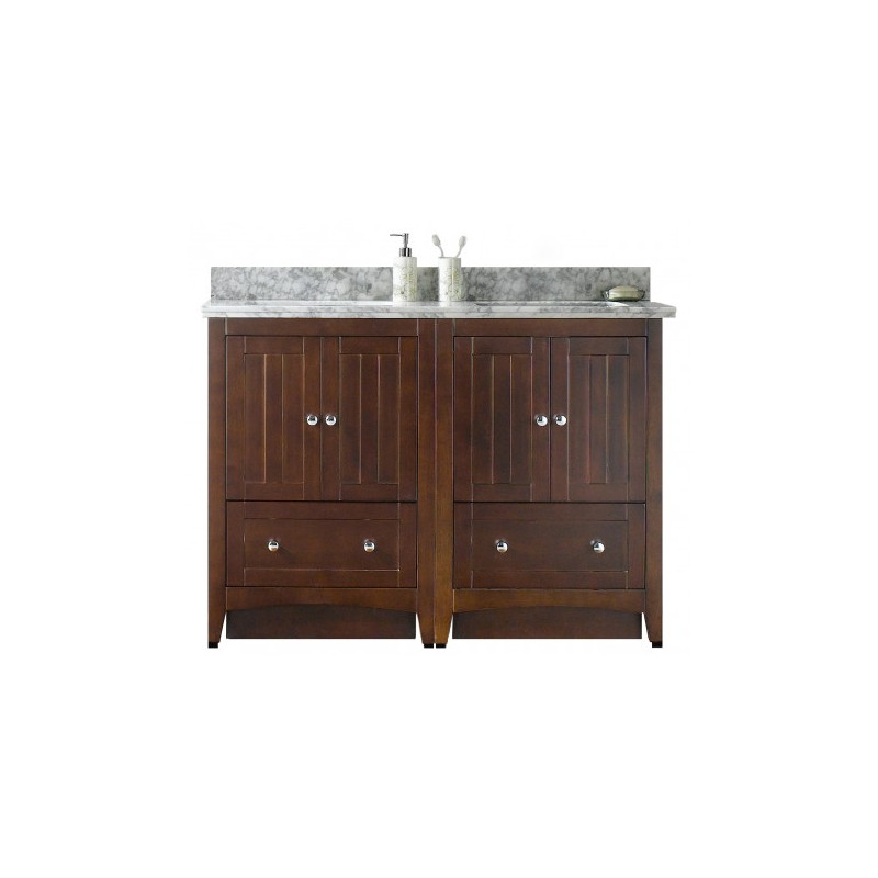 This modern vanity set belongs to the exquisite Shaker design series. It features a rectangle shape. This vanity set is designed to be installed as a floor mount vanity set. It is constructed with plywood-veneer. This vanity set comes with a lacquer-stain finish in Walnut color. It is designed for a single hole faucet.