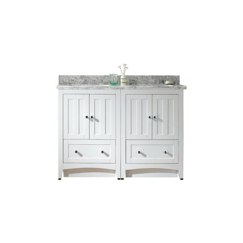 This modern vanity set belongs to the exquisite Shaker design series. It features a rectangle shape. This vanity set is designed to be installed as a floor mount vanity set. It is constructed with plywood-veneer. This vanity set comes with a lacquer-paint finish in White color. It is designed for a single hole faucet.