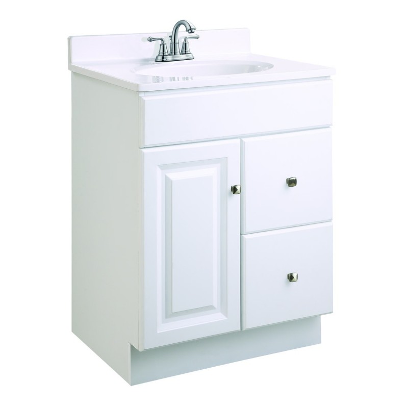 The Design House Wyndham Unassembled Vanity Without Top features a durable white finish and satin nickel knob hardware. Perfect for any style home, this vanity has clean lines and concealed hinges. The 1-door, 2-drawer construction gives you plenty of storage for toiletries to keep your countertop free of clutter. The door and drawers open with a fluid motion and can endure moderate stress. This vanity is the perfect size for any bathroom. The frameless design provides ample storage and accessibility to store toiletries for the entire family. Traditional construction meshes with subtle modern details to quickly brighten up your bathroom. This product is perfect for remodeling your bathroom and matches granite countertops and colored walls.