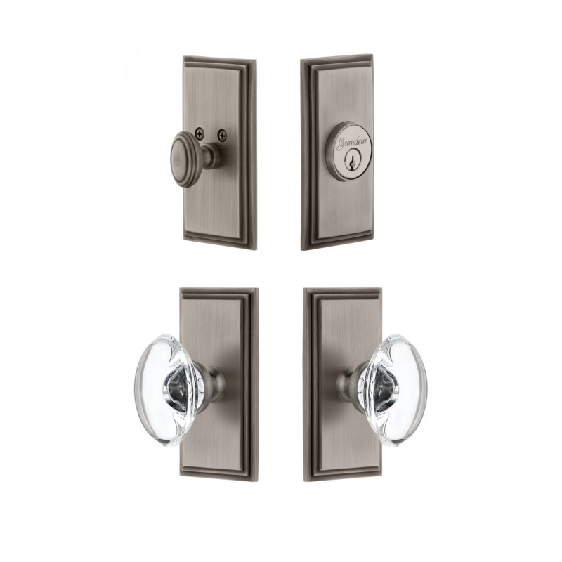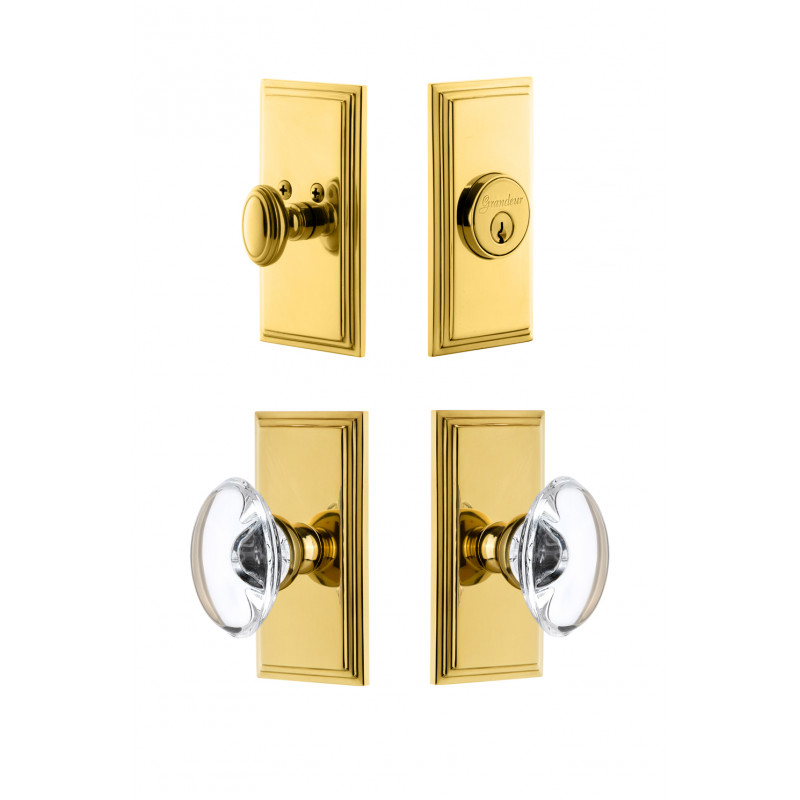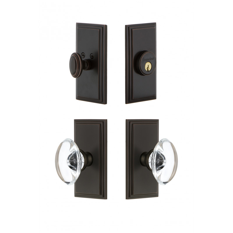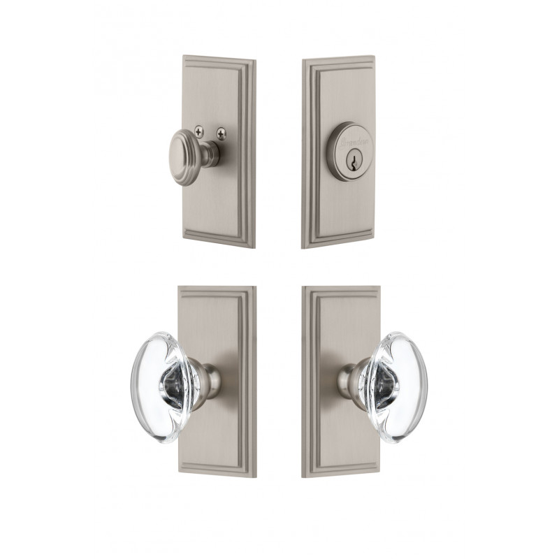 The Carre plate, with its clean parallel lines and uncomplicated shape provides for endless versatility. The addition of the oval Provence Crystal Knob, and matching Carre Deadbolt, for a rustic, yet sophisticated charm. All Grandeur knobs are created from 24% lead crystal for unparalleled clarity and beauty, and mounted on a solid (not plated) forged brass base.