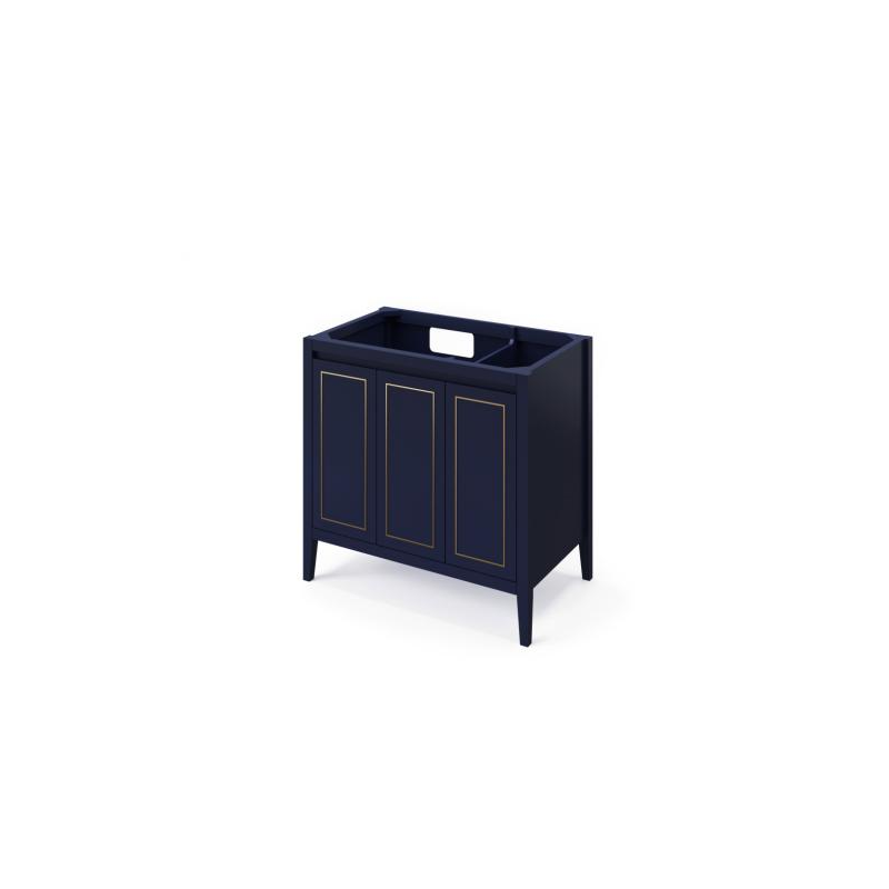The Percival vanity collection by Jeffrey Alexander simply enriches a room with dignified grace. Refined elegance is accentuated through Percival's quiet and peaceful nature. The doors are adorned to perfectly complement the vanity's finish. This subtle metal accent trim is all the ornamentation needed to generate a resplendent presence in a room designed with class. Behind each soft-close door lies a cabinet with an adjustable shelf and dovetail rollout drawer. Storage space is maximized by equipping the rollout drawers with full-extension soft-close undermount slides. The 36" unit opens the two left doors to reveal an adjustable shelf with a full-extension, soft-close dovetail rollout drawer beneath as well as a third door that unveils a second adjustable shelf with another full-extension, soft-close dovetail rollout drawer beneath. Black is trimmed with glistening Polished Chrome; Hale Blue and White are gilded with Satin Bronze; Grey and Natural Oak are accented with Matte Black, and Brushed Gold is stunning on Dark Walnut. Each metal trim paring brings out a style that is uniquely suited to Percival's simple and elegant design.